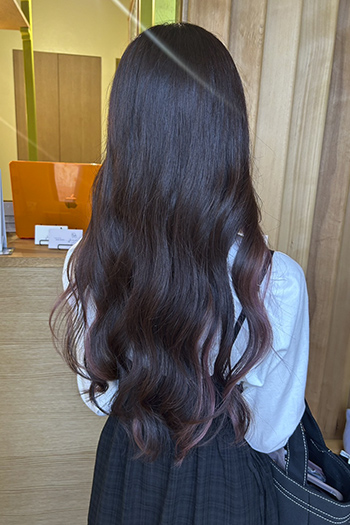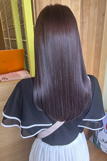 植物由来のオイルとエッセンスが全体の92%を占めるカラー材です。 やさしい質感と艶が特徴で、カラーバリエーションも豊富です。 ロング料金(鎖骨まで¥550、鎖骨から胸上¥850、胸下¥1,100)、単品メニューの場合シャンプーブロー別途¥1,100がかかります。 表示価格は税込です。
